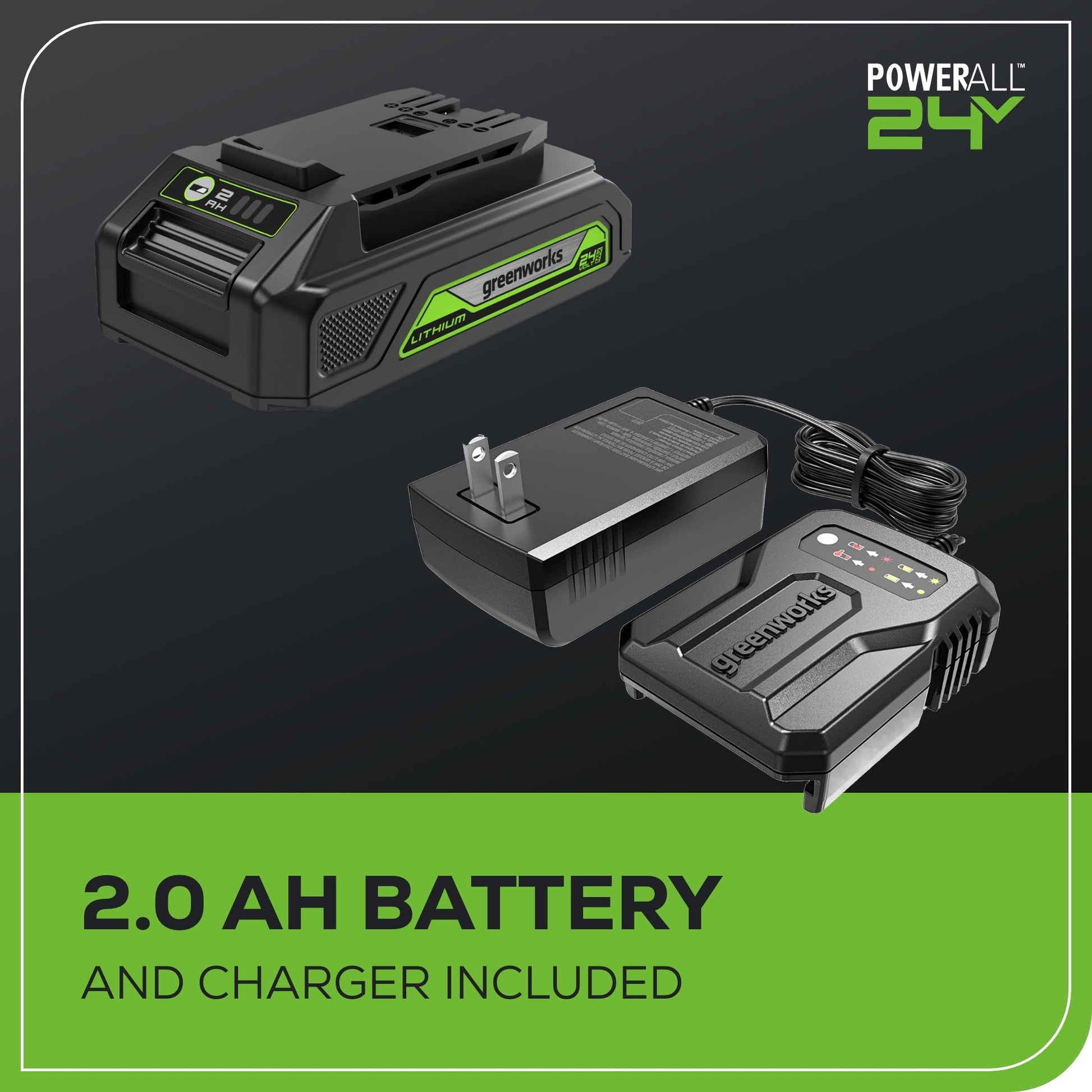 - What's included: One (1) 24V Battery (2.0 Amp hours) with Charger