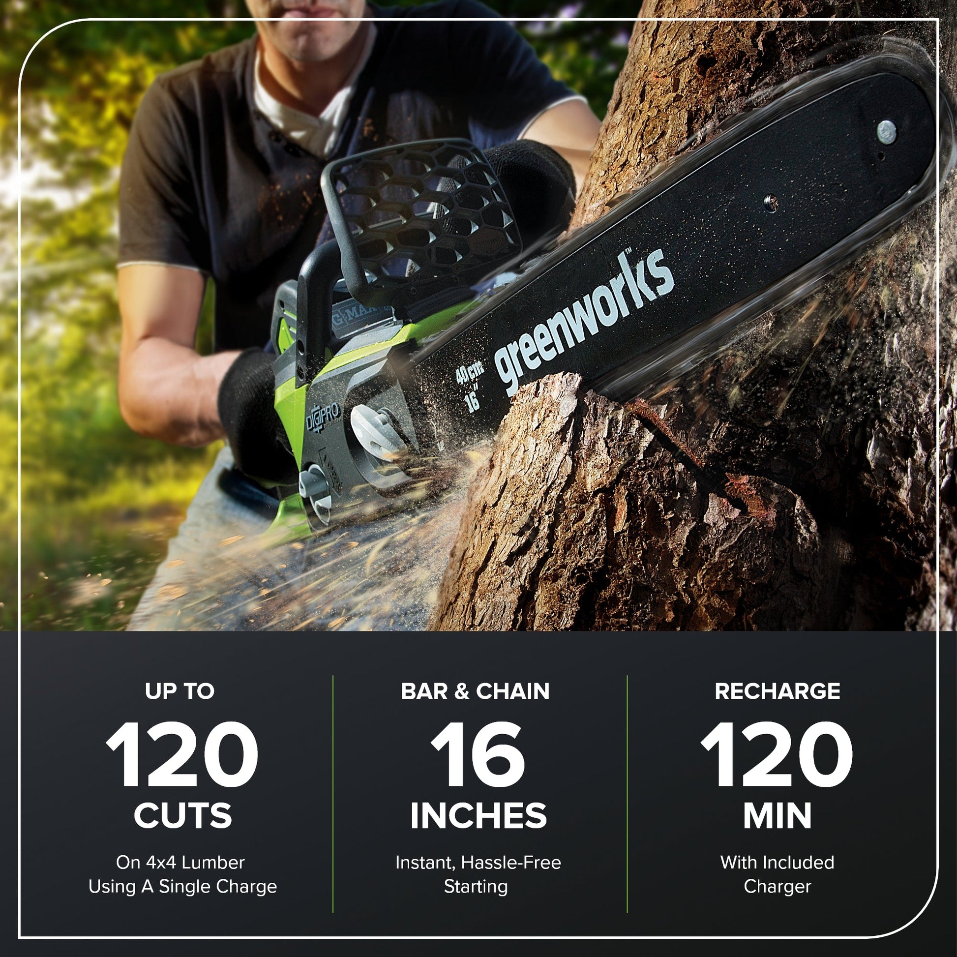 - Included 40V Battery powers 75+ Greenworks 40V tools